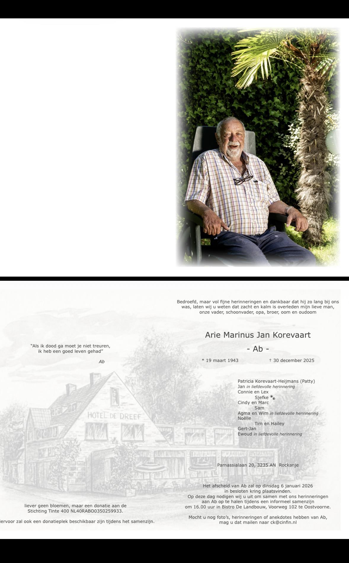 Wij ontvingen het droeve bericht dat onze vriend en medewerker Ab Korevaart is heengegaan